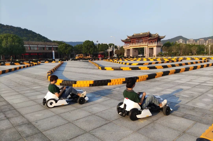 刚步入九龙湖,映入眼帘的便是一条长长的柏油马路。马路边就是滑草场,还有一些餐饮小食店等。