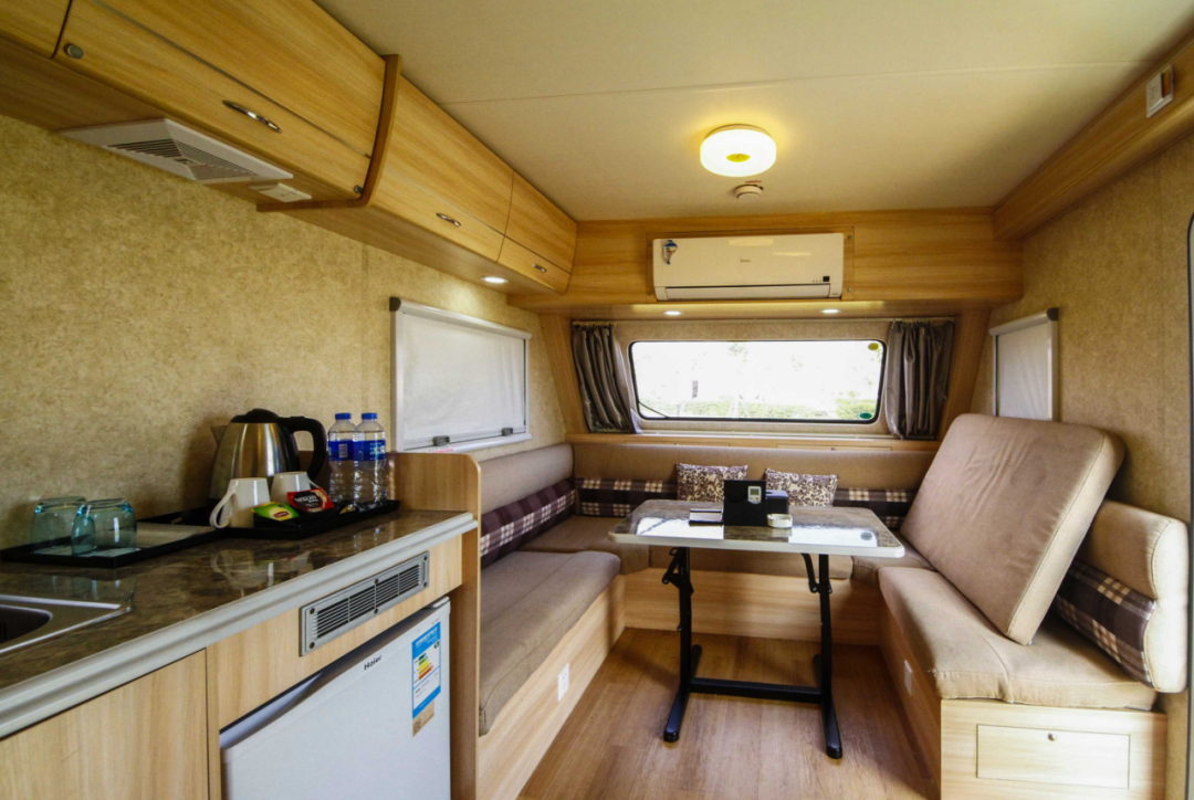 房车内电视机、空调、壁柜、热水淋浴、洗手台等一应俱全